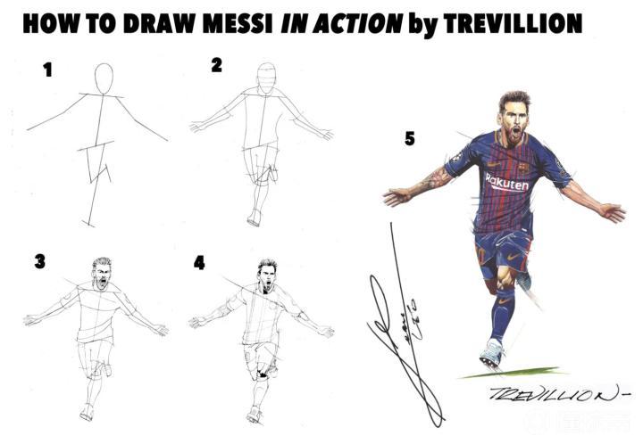 保罗-特雷维里翁还教授了如何画梅西的运动照,和画肖像的方法类似,用线条确定身体各个部位的位置,然后逐渐丰富细节。他在文章中表示,这不需要太多的经验,只要跟随方法和准则去实践就能完成。