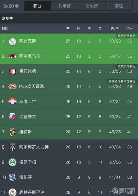 在荷甲联赛中断前,阿贾克斯与阿尔克马尔同积56分,阿贾克斯因为净胜球的关系排在第一位,老牌劲旅费耶诺德和埃因霍温同样仍有希望冲击欧冠资格。