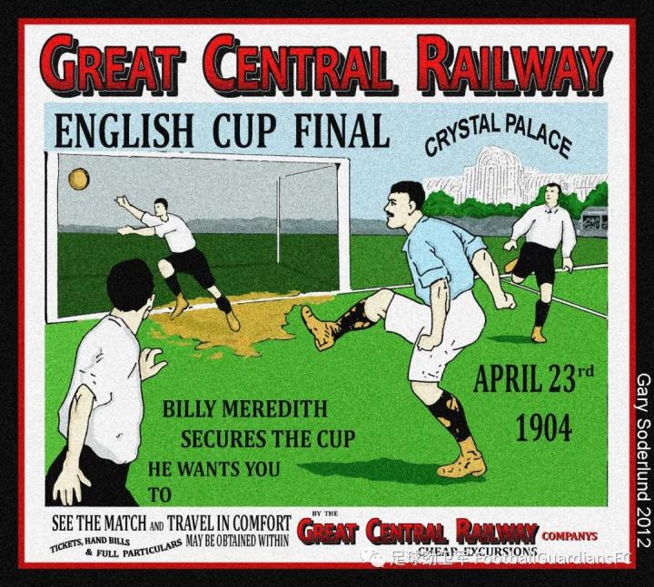 但当时英国的职业俱乐部普遍使用各种方法规避上述规定。在1906年,可能是世界足坛首个吹哨人出现了,他是威廉·亨利·梅雷迪斯(William Henry Meredith),威尔士国脚,英格兰足坛当时的超级巨星。他1894年加入曼城,1895年变成世界上首批职业球员,并且很快当上曼城的队长,帮助俱乐部在1904年夺得足总杯。(上图一:铁路公司预测梅雷迪斯射门得分帮曼城夺得1904足总杯的宣传画;上图二:曼城2019年再夺足总杯)。