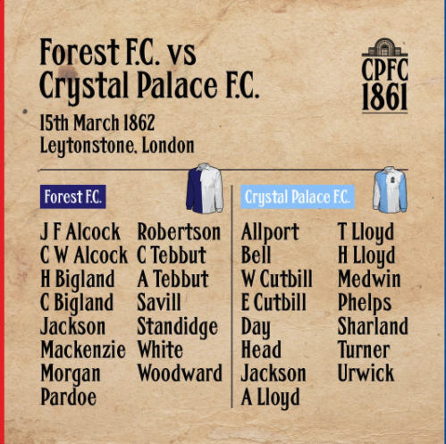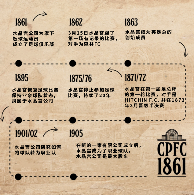 在维多利亚时代,英格兰的板球运动员会在冬天踢足球,来保持身体状态。因此水晶宫板球运动员在1861年成立了他们自己的足球队。球衣的颜色为蓝白,第一场有记录的比赛是在1862年3月15日对阵森林FC。