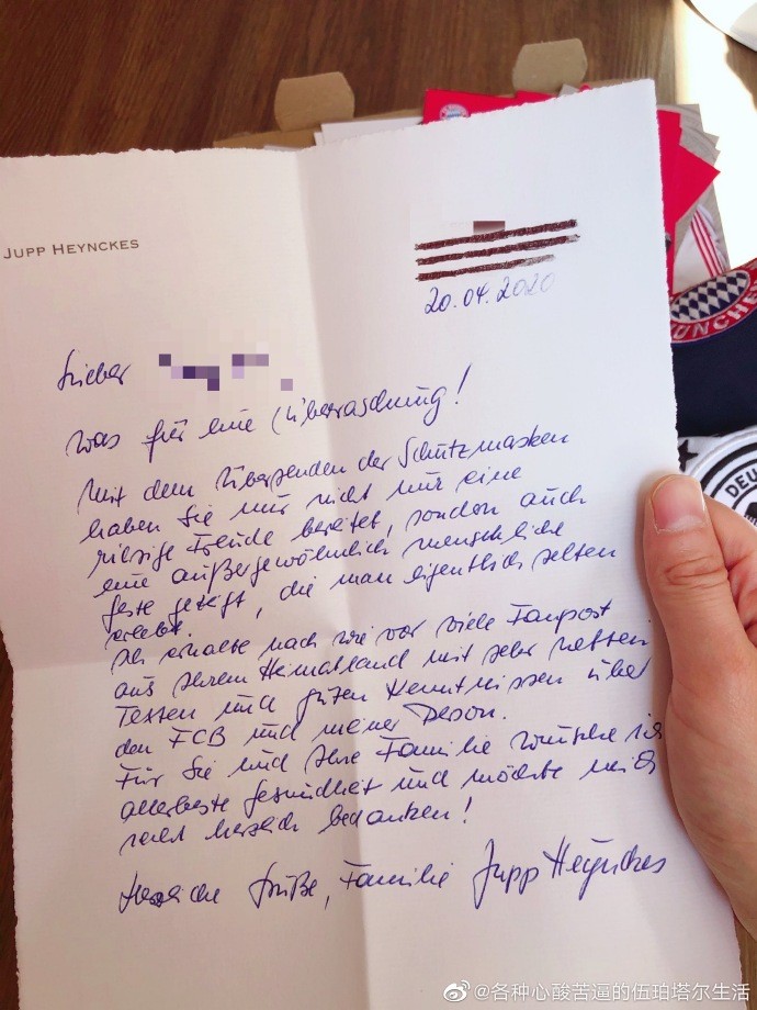 此前,微博名为@各种心酸苦逼的伍珀塔尔生活 的中国拜仁球迷向海因克斯寄了口罩,后被回赠三件球衣。