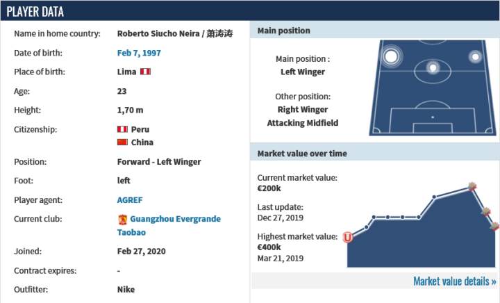 萧涛涛(Roberto Siucho Neira.1997.2.7)23岁,身高170cm,体重65kg,司职边锋,最高身价40万欧元。出生于利马,原秘鲁籍华裔球员,祖籍中国广东中山大涌镇南文村。