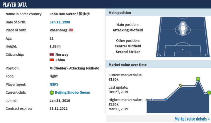 侯永永(John Hou Sæter.1998.1.13)22岁,身高180cm,体重74kg,司职中场,最高身价25万欧元。出生于罗森博格,原挪威籍华裔球员,母亲侯豫榕系河南洛阳人。