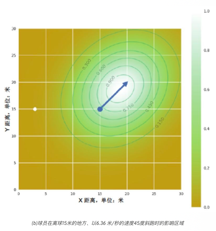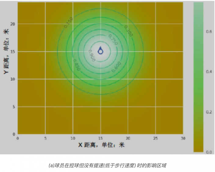 根据他们在时间上的位置,球员对于附近的区域可能造成不同程度的影响。当一个球员离球很远时,他的影响力水平可以被理解为在一个更广泛的区域,这是基于这样的推理:如果球向球员转移,他需要更多的时间才能在更大的空间内接到球。相反,当球员靠近球的时候,如果球从现在的位置转移,那么球员触到球的可能性就会更小。此外,球员的速度在确定影响区域方面起着重要作用。与行走或慢跑相比,跑动起来的球员在速度方向上的区域影响力可能更大。此外,球员在近距离空间里的影响力水平可能比在更远的空间中要高。