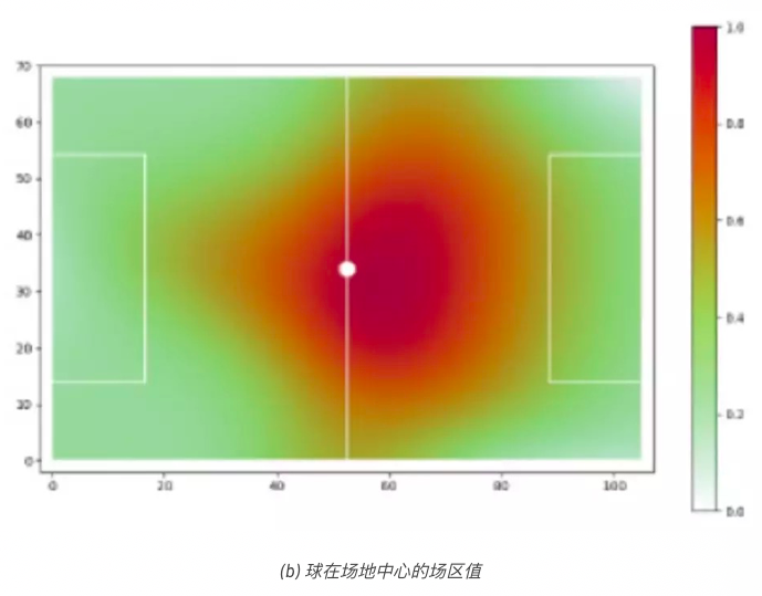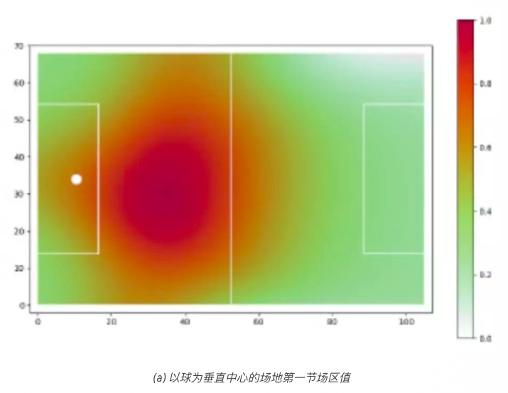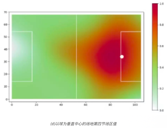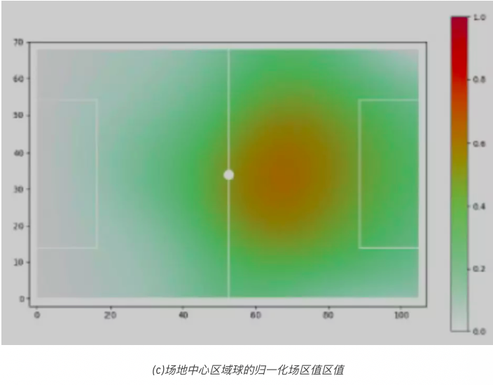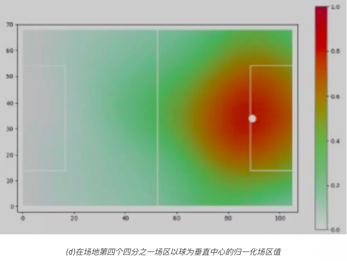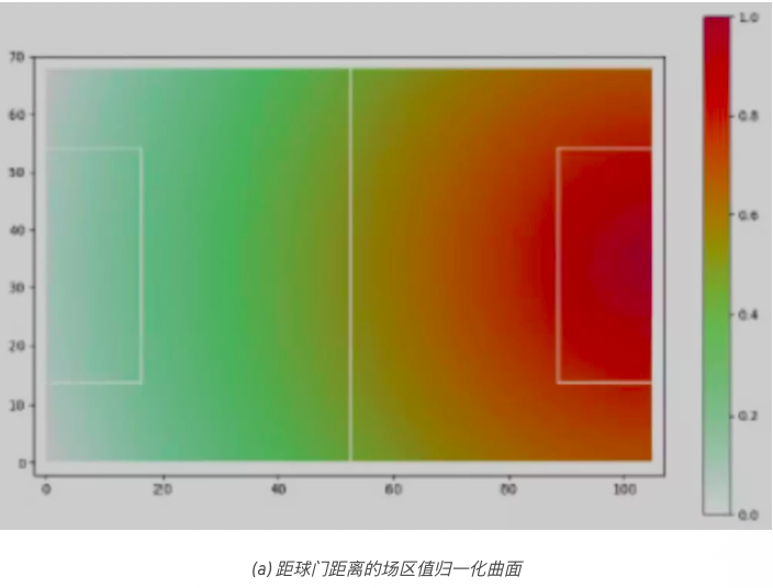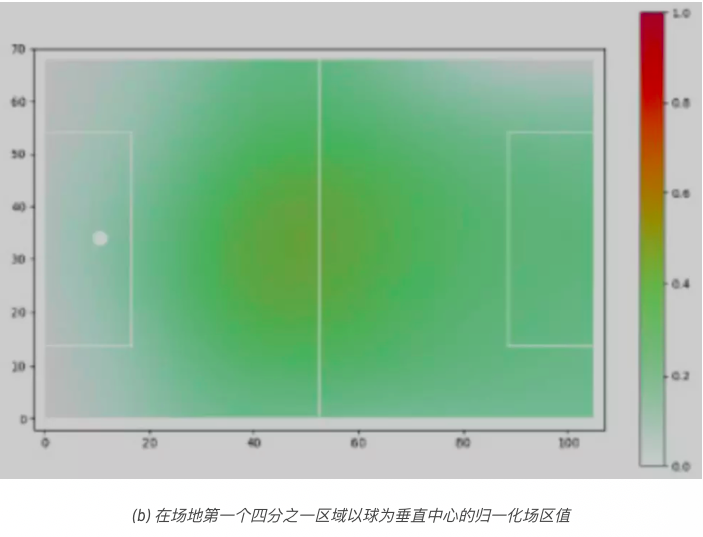 从该模型我们了解到,球附近的位置在一定范围内其价值不断增加,这样就可以有效地理解如何根据球的位置来转换场区值。此模型尚缺乏直觉推理。在第一个四分之一场区的位置值较高的位置的空间生成,不应与最后一个四分之一场区的有较高的位置值的位置有相同的估值。换句话说,当场区越往前,越接近对方的球门,空间的累积值就越高。为了适应这种直觉思维方式,我们将获得的场区值依据位置距球门的距离,在[0,1]范围内归一化。