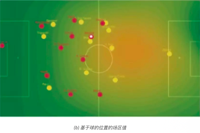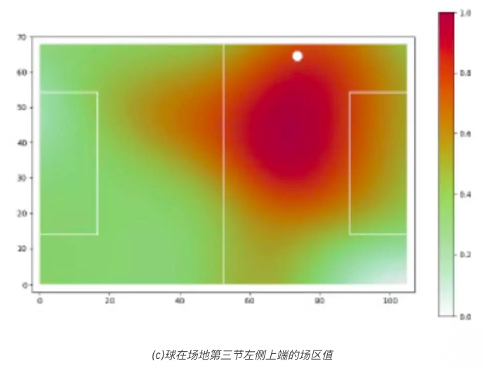 根据专业人士分析,图5显示了归一化表面和三种不同的场区值情况,所有结果仍适配 球的位置。但显示出更加一致的场区估值, 这应对了对球位置的作用。我们看到当本方守门员控球时,全部场区的空间值是有限的。但是如果在对手的禁区里,空间值则高很多,因为它可以带来有威胁的射门。