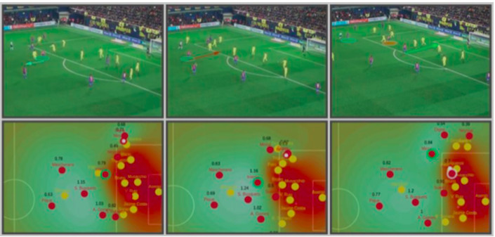 图1显示了在西班牙官方第一级别比赛中,空间占据和空间生成的一个例子。三张图展示了安德烈斯·伊涅斯塔(Andrés Iniesta)移动的整个过程。在这个过程 中,他先移动离开球,拉出空当; 然后在禁区内拼出一个高价值区。当他移动到这个空间时,他把三个防守者吸引向自己,同时也接到了传球。这三名被吸引开的后卫给梅西留下了空当,梅西在这个新发现的空间里在没有人盯防的情况下接到传球,随后吊传球给苏亚雷斯,苏亚雷斯同时向球门线跑去,寻找有价值的得分空间。下面可以看到一个更详细的空间占据和空间生成的视频示例。