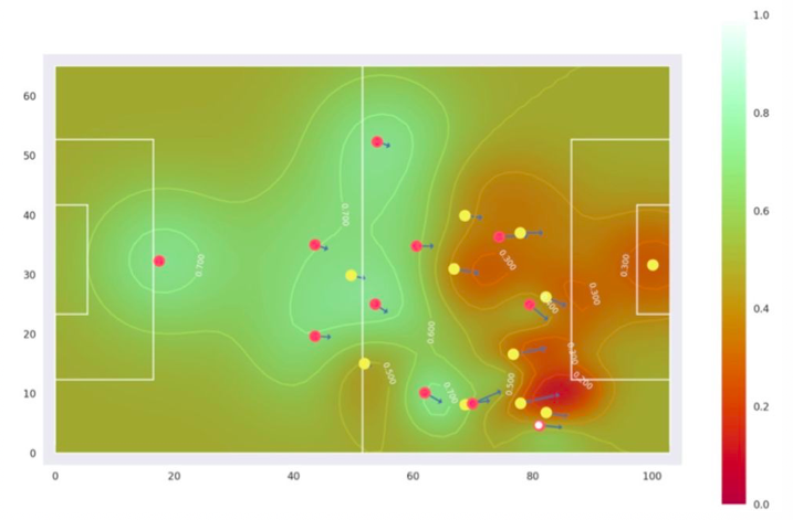 图3 场区控制面显示红色球队的控制程度。箭头显示球员的速度,轮廓线使几何图形的表面可视化。白色数字表示其绘图位置的场区控制值,轴线维度以米为单位。