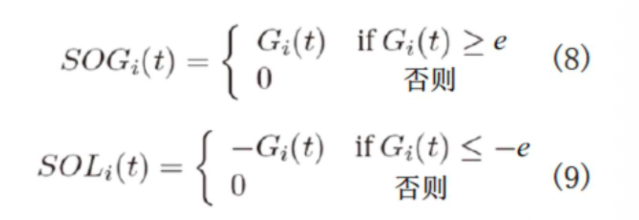 考虑到足球的动态性,球员始终处于一个赢得空间和失去空间的不间断过程中。当球离开球员时,附近的防守球员跟随球移动,这时可能出现一小块空当,让球员更好地控制空间。然而,在高速跑动状态下,进攻者和防守者之间也会出现同样的情况,进攻者会移动得稍快一些。 在另一种情况下,当球员向空当移动时,所得空间可能中等或较多。鉴于此,有必要定义一个空间所得水平,从这个水平上所得的空间可以被看作是一种真正的占据优势,而不是特定场景下缓慢移动之后自然而然的结果。我们设置了一个常数ε作为阈值来说明空间占据所得,前提条件是空间占据所得应高于该阈值。我们将同样的方法用于空间占据损失。这两个表达式分别在方程式8和9中加以定义。