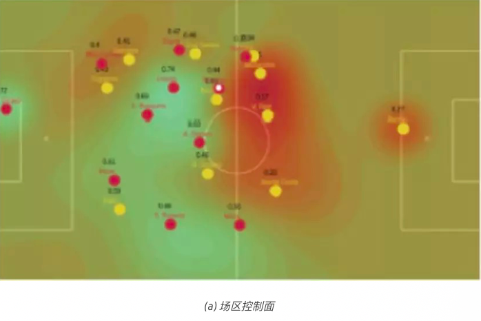 场区控制是团队运动空间优势分析中的一个反复出现的概念。它可以定义为一个既定球员(或球队)在赛场活动区域内的任何一点上所具备的控制力或概率。球员跟踪数据的出现导致产生了不同的场区控制(或支配区域)模型。其中一种被广泛使用的模型是Voronoi多边形网格。它将所有球员在场上的位置统计在内,算出距离每个既定空间点最近的球员,并为每个球员寻找优势单元格。该模型已被用于量化在限定的场地中攻防双方的支配区域[1]、评估基于传球行为的空间优势[2]、改进传球概率模型[3]以及评估篮球运动员拼抢 篮板球的位置价值[4]等各类应用。由多 喜(Taki)和长谷川(Hasegawa)[5] 提出 的球队运动的原始模型[5],提供了可用于 更快运算的扩展以及包含运动和支配空间 的加权估值的扩展[3,6]。除了这些优势 之外,所有基于Voronoi多边形网格的不 同类型方法都是从寻找由特定球员独自支 配的区域这样的想法开始。这一概念忽视 了空间所有权是连续的,而不是分立的, 在两名球员中由谁控制区域方面存在不确 定性。此外,球员与球之间的距离也被认 为会影响相对位置和空间控制力的水平, 特别是对诸如足球等场地较宽的运动项目 而言。不过,上述方法并没有考虑到这一点。