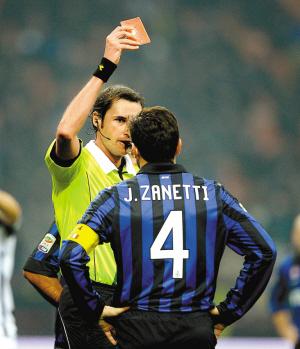 那是在2011-2012赛季,国米对阵乌迪内斯,当时国米0-1落后,第85分钟时,眼看着对方要扩大比分,萨内蒂禁区内铲球,被出示黄牌,累计2黄被罚出场。萨内蒂从1995年加盟国米后,长达17个赛季,连续550场意甲没有红牌的纪录,宣告终结。