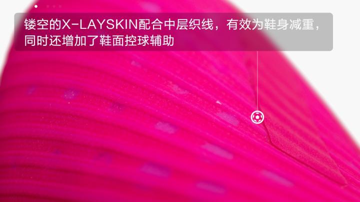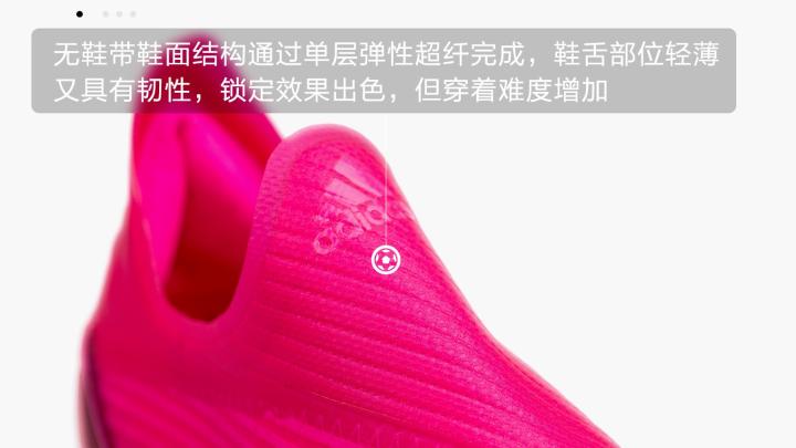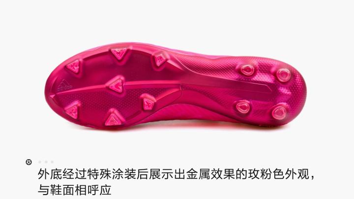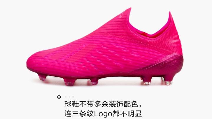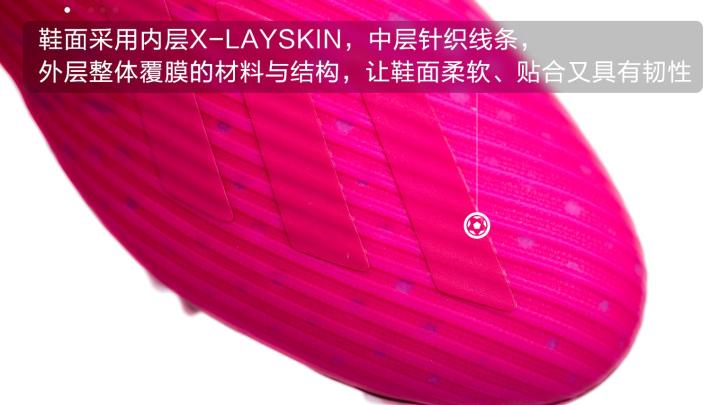 阿迪达斯X19+足球鞋已经接近换代,早前全新的X系列战靴也曝光出谍照,所以这双玫粉色无鞋带战靴, EZer们且买且珍惜。X 19+足球鞋使用了X-LAYSKIN鞋面,包裹、贴合效果比起X18+更为明显。同时,鞋面覆膜也配合内侧进行全面调整,在耐久度和摩擦性能上也明显提高,整个鞋面的触感与穿着感很不同。