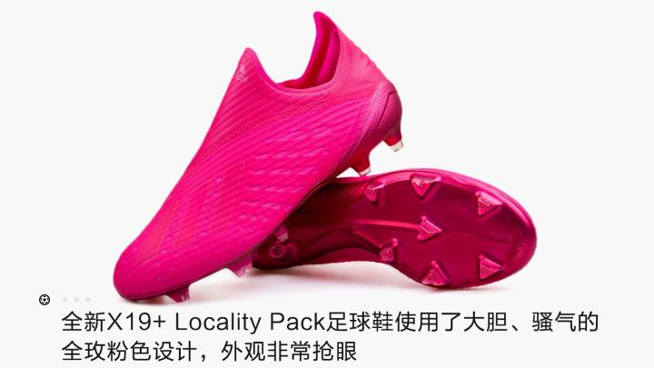 ENJOYZ足球今天我们继续为EZer们介绍阿迪达斯全新Locality Pack系列,红色Predator 20 Mutator之后,再来玫粉色X19+吧!有喜欢这双速度战靴的小伙伴吗?