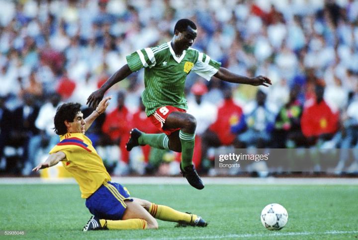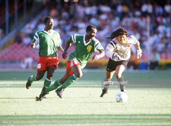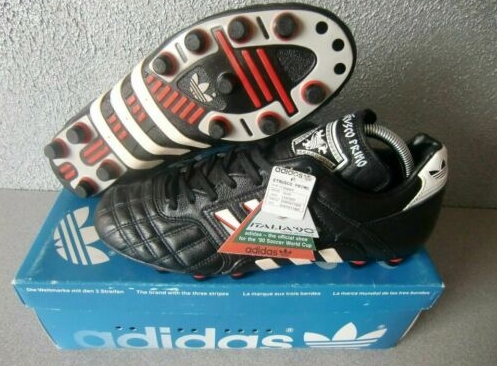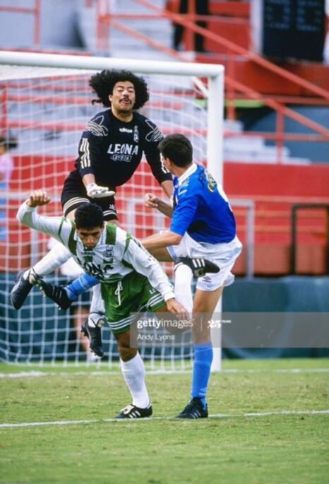 而在八分之一决赛面对喀麦隆的比赛,哥伦比亚本来以为是天上掉馅饼了,遇到个小组第一居然是非洲雄狮。非洲狮和美洲狮90分钟互交白卷,加时赛,喀麦隆神人米拉大叔登场,他在106分钟率先打破僵局,失球后,伊基塔安奈不住了,开启狂人模式,冲出禁区准备组织进攻,结果又是米拉大叔杀来断球,伊基塔准备拉球过人,没想到杯大叔断球后打空门得手,这个失球也让伊基塔在世界足坛名声大噪,成为了玩花活砸锅的经典教材。那年伊基塔使用的球鞋是adidas90年世界杯款etrusco,这双鞋鞋舌上有三个狮头图案,和世界杯用球一样。下图中出现的哥伦比亚后卫正是他在麦德林国民竞技的队友安德烈埃斯科巴。