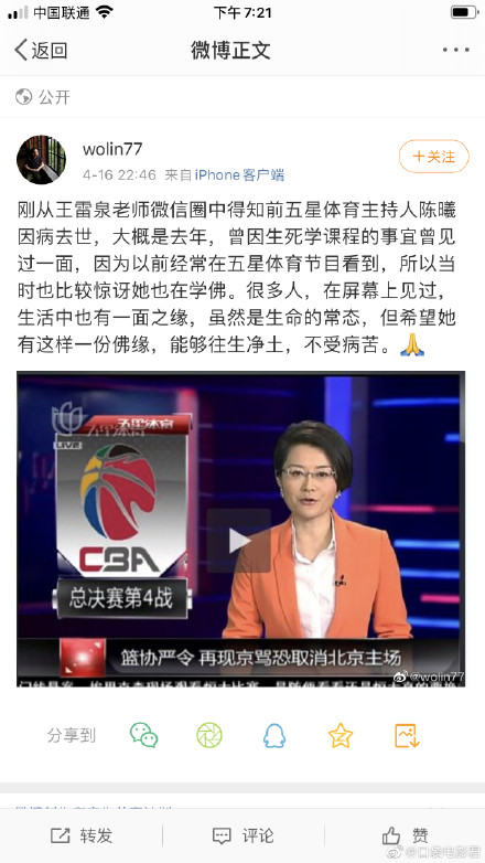 晚上下班刷微博,突然看见@五星体育发了一条微博,五星体育主持人,陈曦(又做晨曦)已于半个月前去世。