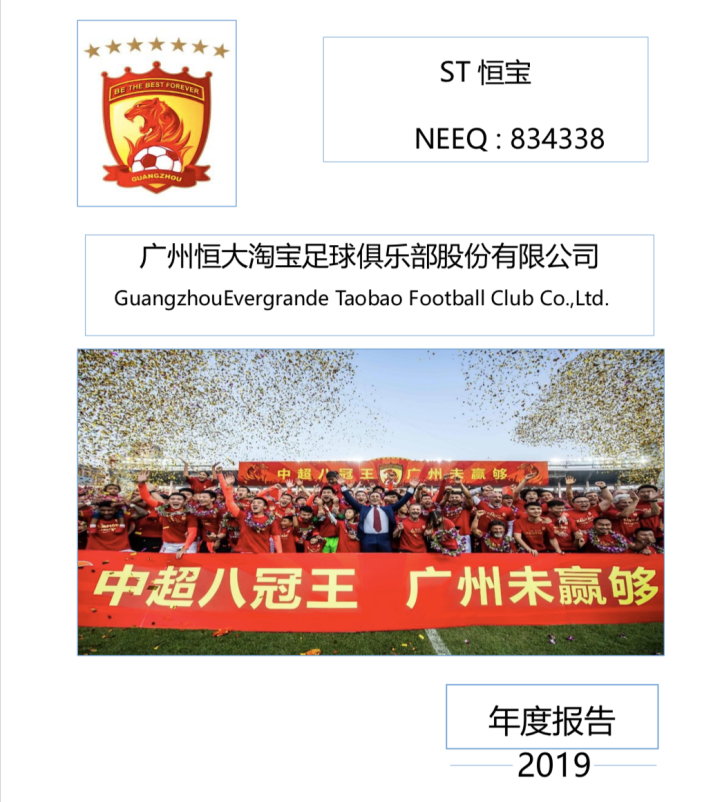 2020年4月28日晚,新三板公司「ST恒宝」——即广州恒大淘宝队公布了他们的2019年财报,在财报首页,是题图这张「中超八冠王」的荣耀时刻,而在财报之中的数字也同样惊人。虽然整个2019年,恒大队的总收入由2018年的6.69亿增长到9.4亿元,但其恒大俱乐部总投入也达到了惊人的28.9亿元,整个算下来,亏损来到了19.43亿人民币。