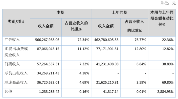 根据恒大方面在财报中关于营收数据的公示,2019赛季广告收入达到了5.66亿,其中母公司恒大地产集团贡献了4.63亿人民币。