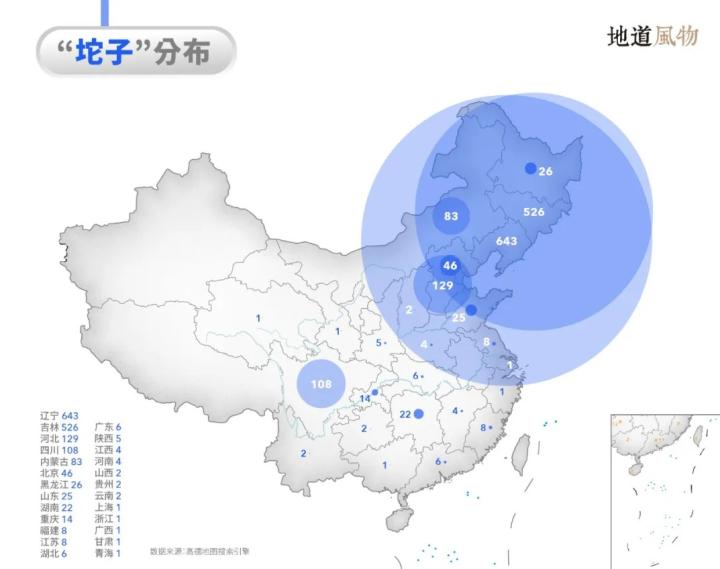 全国各省份中,东北对“沟子”的青睐遥遥领先:辽宁省拥有“沟子”地名340余处,最知名的一处是《不差钱》中“丫蛋”的老家,铁岭市的莲花镇“池水沟子”。