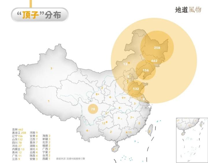 ▲“顶子”地名分布。制图/周三
