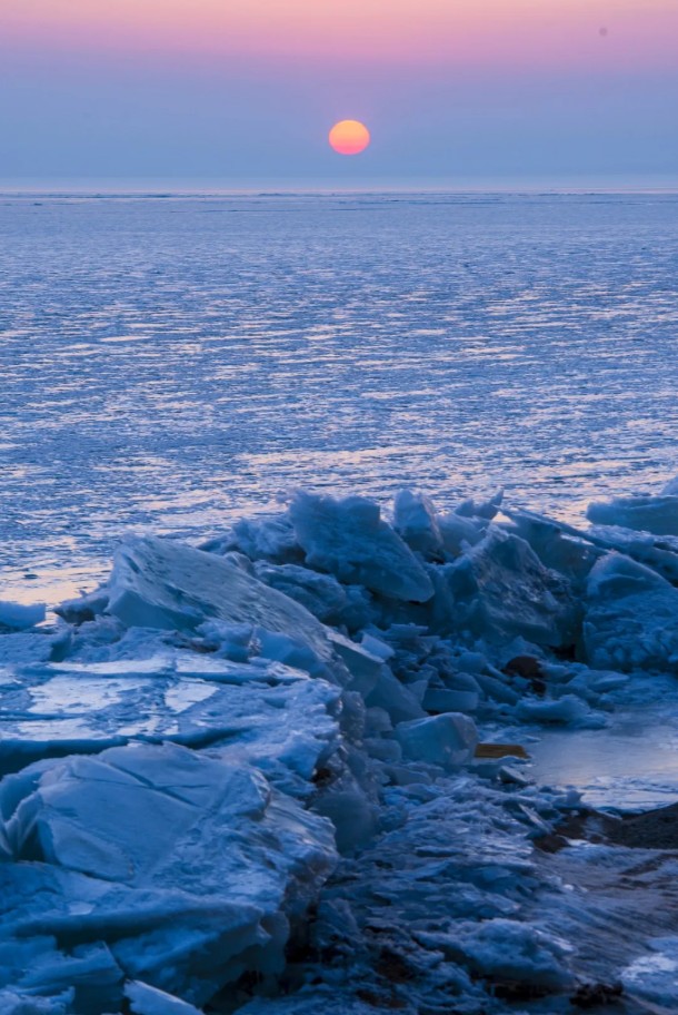 ▲ 黑龙江鸡西,夕阳西下的中俄界湖兴凯湖,成了蓝冰世界。图/视觉中国