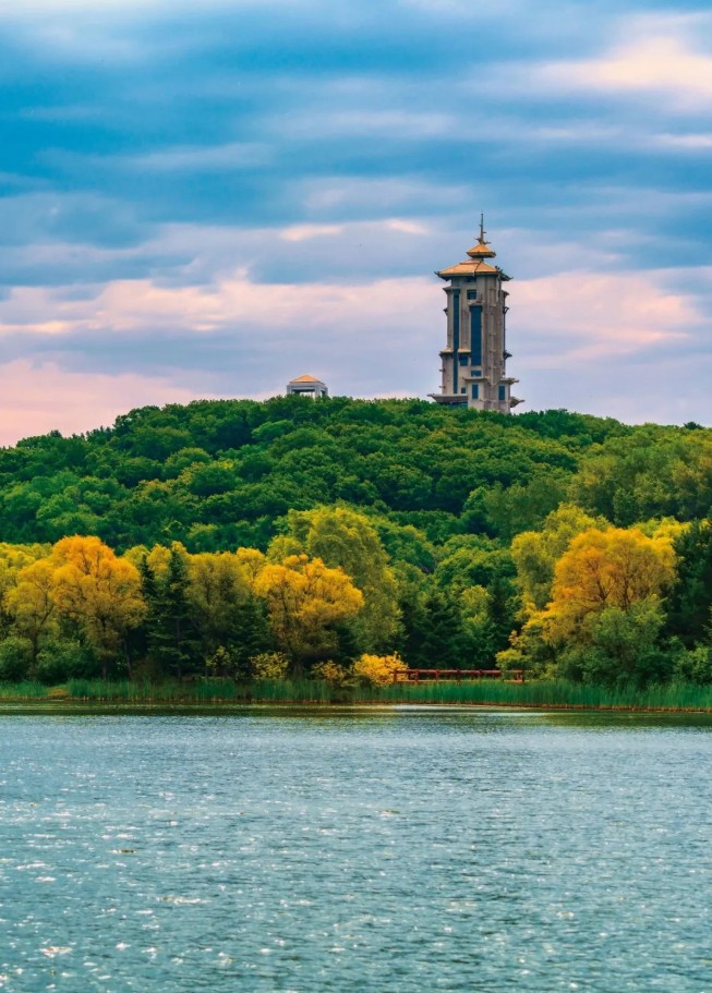 ▲ 长春净月潭国家森林公园,碧松净月塔楼和太平钟楼相伴而立。摄影/石耀臣