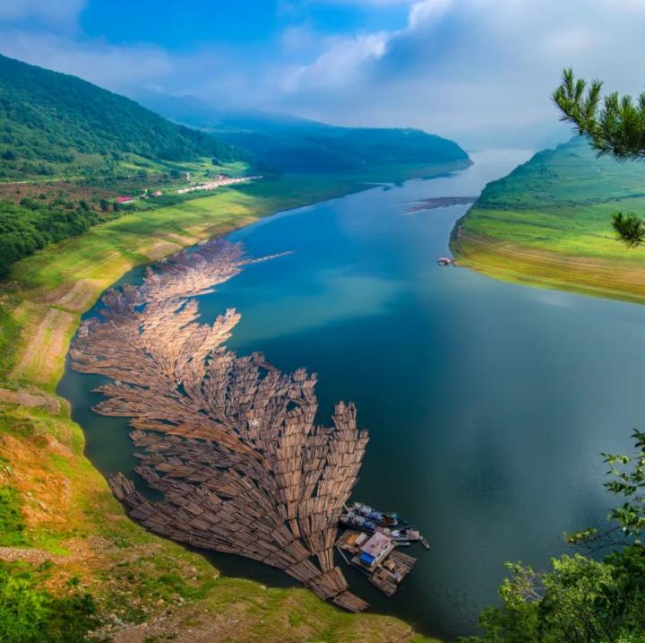 ▲ 中朝界河鸭绿江,在吉林段至今还能看到古老的木材运输方式——朝鲜木排。摄影/常建儒