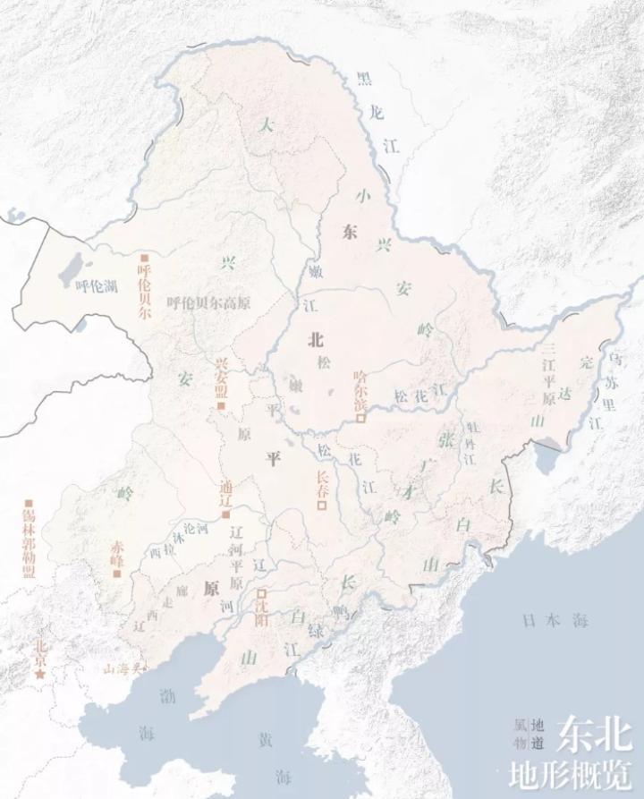 文中 “东北地名”所指范围以辽宁、吉林、黑龙江分布为主,并延伸覆盖内蒙古东部及河北省北部。这里几乎拥有所有地貌景观:山脉、河流、湖泊、沼泽、湿地、沙漠、草原、森林、海滩、岛屿……