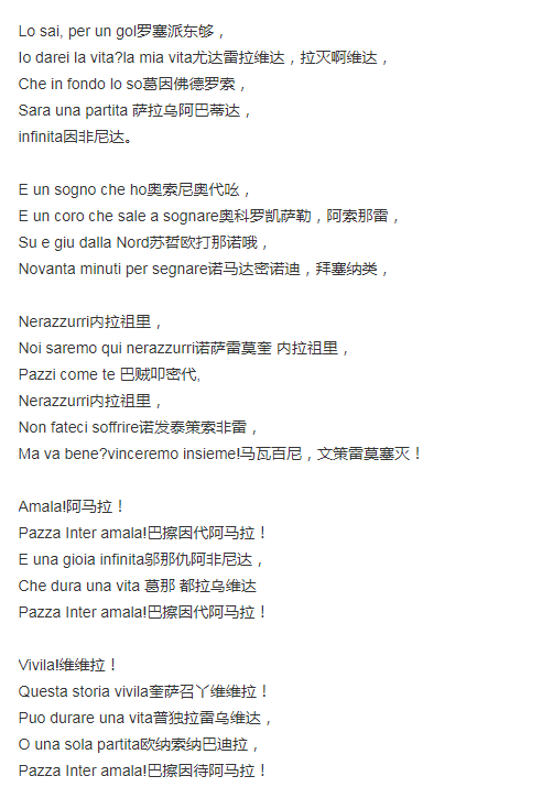 除了搞笑之外,空耳其实在现实生活中也有“应用”的技巧。当年国际米兰和AC米兰来中国踢了一场德比,赛前会在场地里奏响两队的队歌。有人发现,有国米球迷为了流畅地跟唱出队歌,把队歌的发音全部以中文的方式表达,写在了纸板上。网络上也有国米球迷用这样的方式给其他球迷普及队歌的唱法。画风大概是这样的: