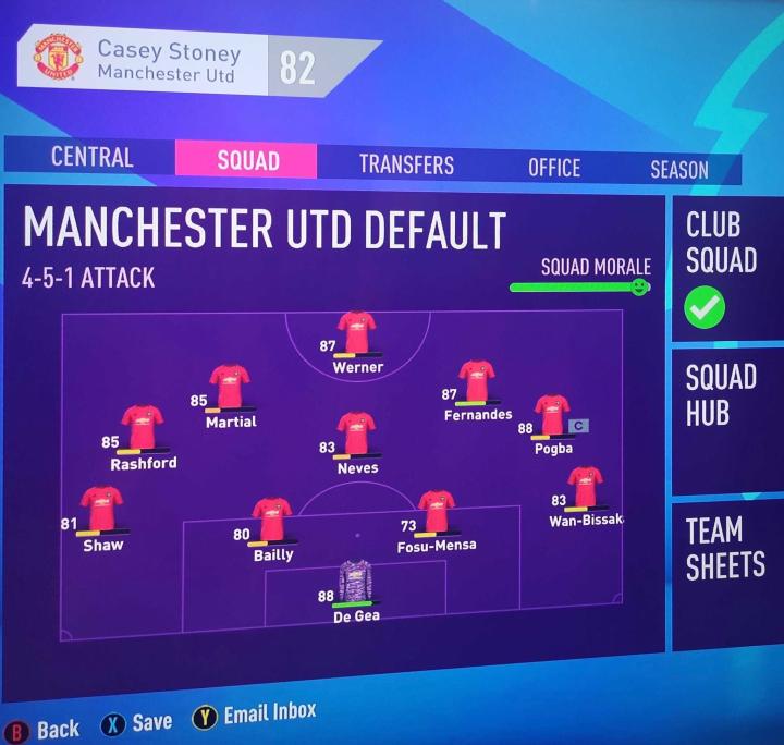 在能力值提升到90以上后,初始门将马马杜-金德姆和我展开了一场合同纠纷。他最终以1亿美元的高价转会巴塞罗那。我的俱乐部队长克里斯多夫-克莱因能力值刚过90,他也开始对我迷之不满。所以,我也可能会卖掉他。目前,球队其他所有首发球员的能力值都在84到88之间,而一些非常有潜力的年轻球员紧随其后。