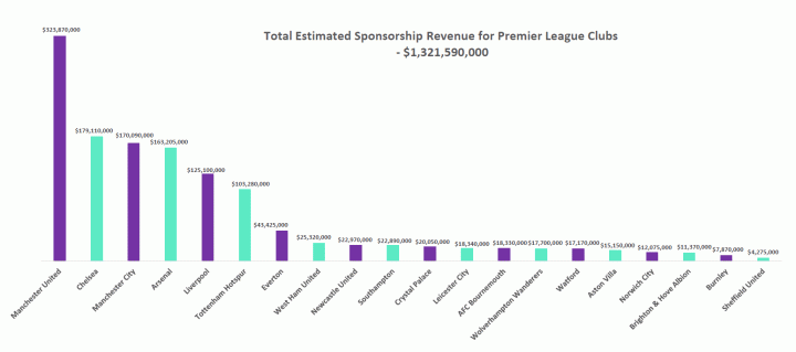品牌的认可在商业中是至关重要的。没有什么比在欧洲最受欢迎的体育联赛中宣传自己的品牌效果更好了,特别是在球队的球衣或者袖口上。拿曼联来说,他们每年从雪佛兰获得6400万英镑的费用。他们的对手曼城从伊蒂哈德得到4500万英镑,利物浦从渣打银行获得4000万英镑。