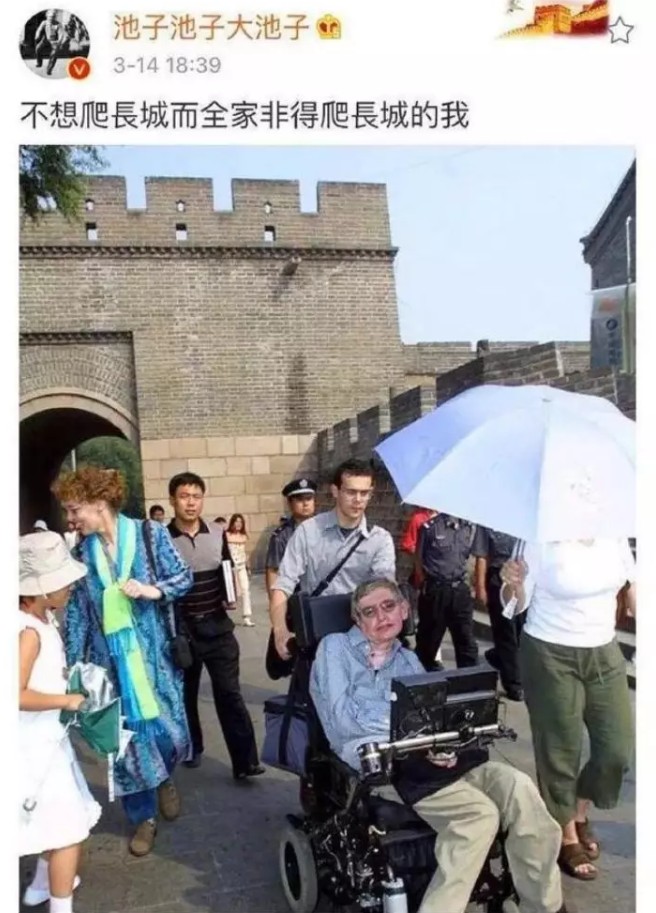 首先是科学家霍金去世,池子发文称:"不想爬长城而全家非得爬长城的我",并配上了霍金坐在轮椅上的照片。