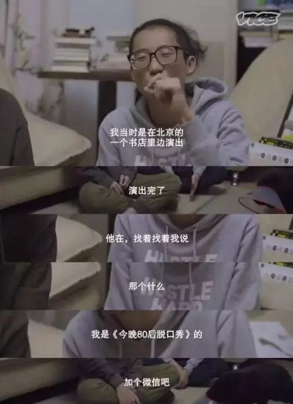 4个月后,他第一次在酒吧演出,演出的内容和酒吧具体地点他都不记得了,只记得自己紧紧张张说完一小段"毫无技术含量"的段子后下场喝饮料,看到一个"白白净净的小眼睛男人"很有礼貌地来加他微信,说要给他一份在电视台做脱口秀的工作。