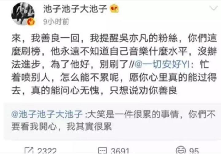 这件事也就算了,更可怕的是他还吐槽吴亦凡粉丝刷榜,还以"善良"之名发博提醒粉丝别再刷说这样他(吴亦凡)只会永远不知道自己的实力。