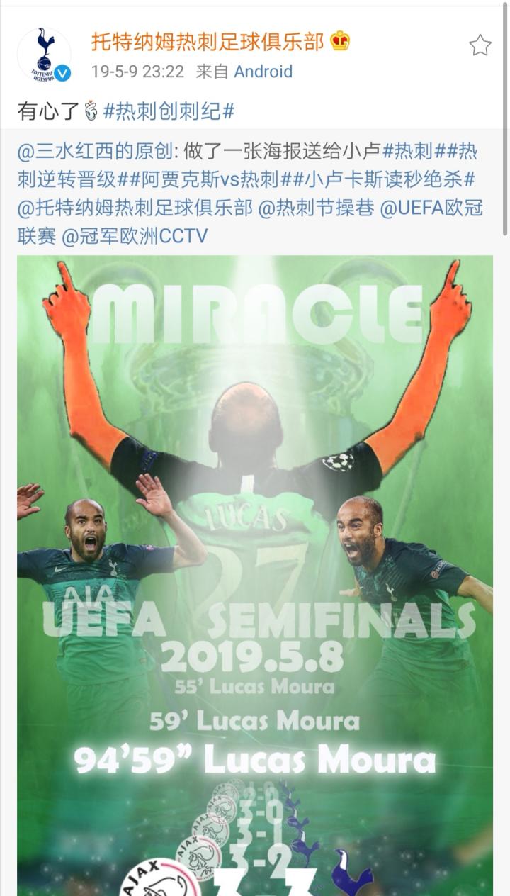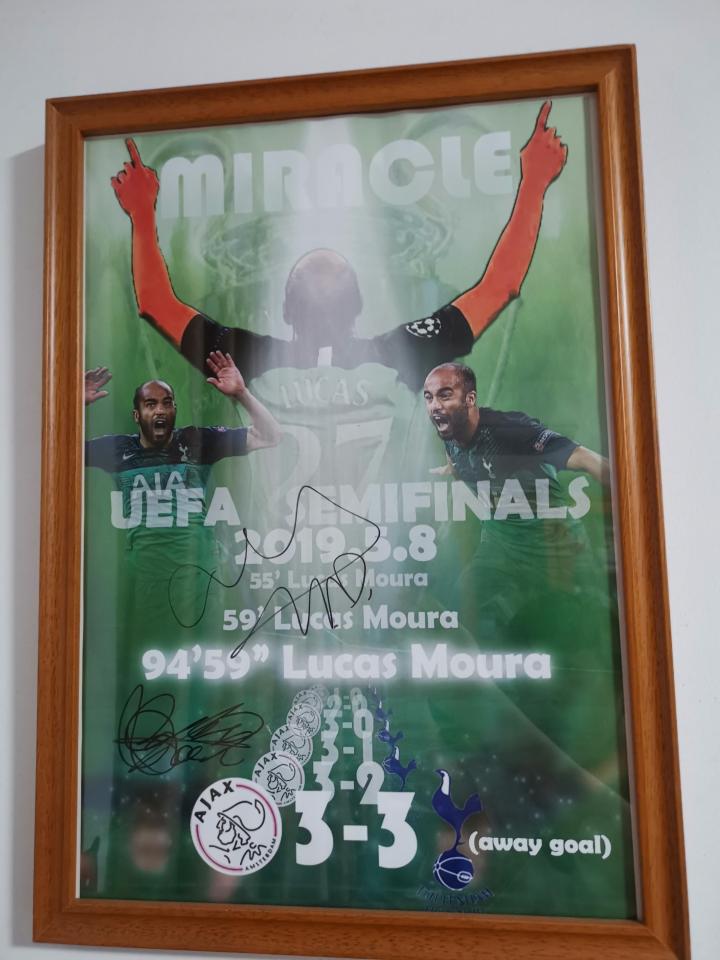 晚上,稍稍定下心来一点的我,决定做点什么记录这一刻,我决定做一张海报来纪念这场比赛,纪念这个永远会留在热刺历史里的名字,卢卡斯-莫拉。做完这张海报后,我把它发在了各种社交平台,甚至在微博里还被官方微博转发了。这张海报意外的火了,其实现在看看,做的挺一般的,甚至有的地方抠图都没抠好,但它承载了我关于这场比赛的所有回忆,夏天热刺中国行,我把他打印了出来,举着这场海报在酒店门口要到了波叔和孙兴慜的亲笔签名,随后我用相框把他裱了起来,挂在了我的卧室里,留作永远的纪念。