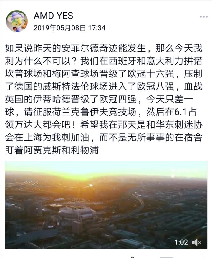 可以肯定的是,我不可能再睡得着了,但也没关系了,因为今天的课我肯定也不会好好上了。我疯狂的刷着各路热刺球迷聚集的社交平台,和他们一起疯狂的在网上庆祝。支持热刺十年来,从没有一场比赛让我感到如此的激动,难忘,不可思议,我见证了热刺建队以来的新历史,十年里,看着球队经历各种坎坷,终于见到了这一辉煌时刻。我和朋友立刻开始讨论决赛去上海参与球迷会的看球活动的事情,我已经等不及看欧冠决赛了。早晨,我穿着热刺球衣走出了宿舍,我疯狂的希望能在外面多待一会儿,内心对身上这件衣服无比骄傲,希望所有路上的球迷都能知道,我是一个热刺球迷,我见证了历史和奇迹。路上,看到我认识的学校里的球迷朋友,即使是伪球迷,开口的第一句话,都不再是寒暄,而是热刺牛逼。我一天的课都基本没听,不断找着各种这场比赛的新闻,集锦,相关视频,从赛后采访,多语言解说,球迷现场实录,球迷家里实录,酒吧实录,欧冠专题节目……等等,一切能找到与这场比赛有关的东西,我都会打开来看,每看一次,都激动的起一次鸡皮疙瘩,甚至眼眶也会湿润泛红起来。下午的足球课,所有人看到我一身热刺球衣,都跟我提起了这场比赛,我也毫不谦虚的在吹着热刺。