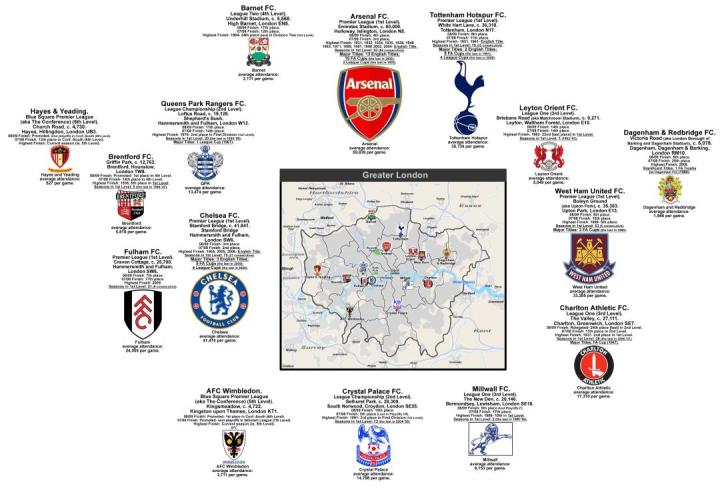 究竟整个伦敦有多少支球队呢?答案:一共是16支足球队。其余的10支分别是米尔沃尔、富勒姆、女王公园巡游者、查尔顿、布伦特福德、AFC温布尔登、达根汉姆和雷德布里奇(Dagenham and Redbridge)、巴尼特(Barnet FC)、赫耶斯(Hayes &Yeading)和莱顿东方。