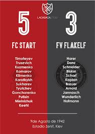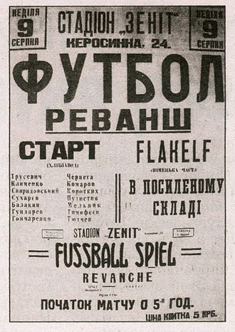 在5-1战胜了当时有着“天下无敌”称号的FlakeIf队后,第二天基辅的大街小巷又贴满了同一内容的海报,上面表示在1942年8月9日两队将进行一次重赛,下面还写着大大的“复仇”一词。所有人都清楚这意味着什么,他们不禁为FCstart祈祷起来,心中两种矛盾的念头不断交织:一方面,他们希望自己的球队能赢;另一方面,他们也意识到德国人在输球后是不会善罢甘休的。