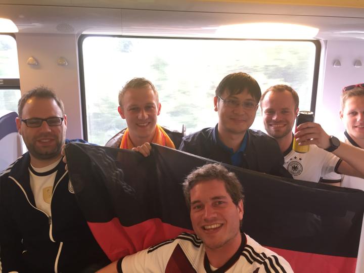 今天的这场八分之一决赛是下午三点开球,对阵双方是德国和斯洛伐克,结果一上火车就遇到了一批从多特蒙德过来看球的德国球迷,和他们合影留念并祝德国人好运。