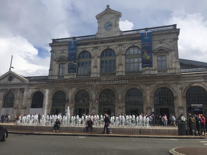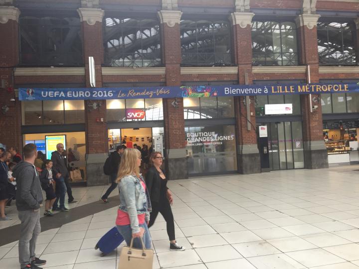 等到了里尔车站发现整个城市几乎都要被德国球迷占领了,毕竟从邻国过来看球很方便。里尔是法国北部最大的铁路枢纽,巴黎、伦敦和阿姆斯特丹三个方向的高铁在此交汇,并拥有两个重量级的火车站:里尔欧洲车站(Gare de Lille Europe)和里尔弗朗德火车站(Gare de LilleFlandre)。前者为现代化的高铁车站,建于1994年,可直达法国的大部分重要城市和荷兰、比利时、英国等地;后者为古老的尽头式火车站,可前往法国北部以及比利时的绝大多数城市。