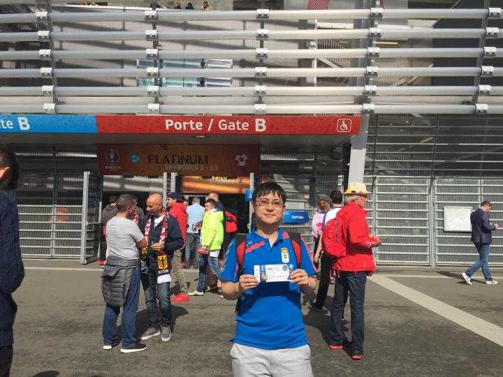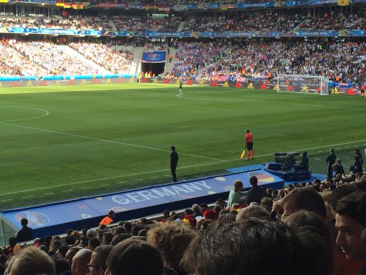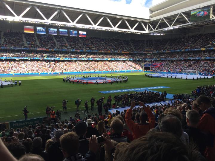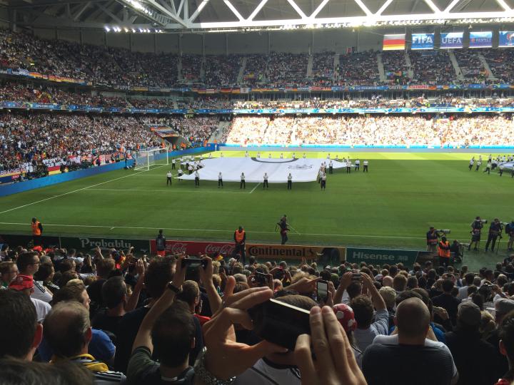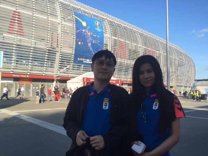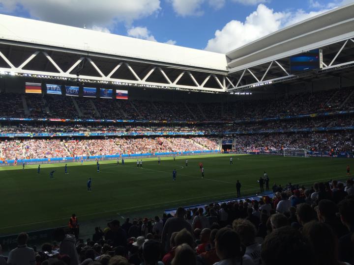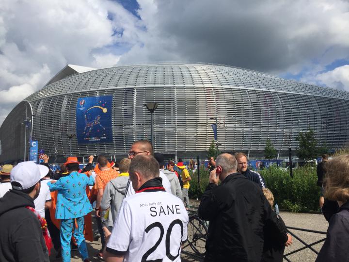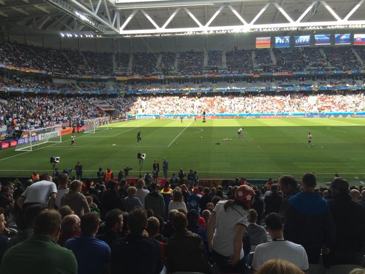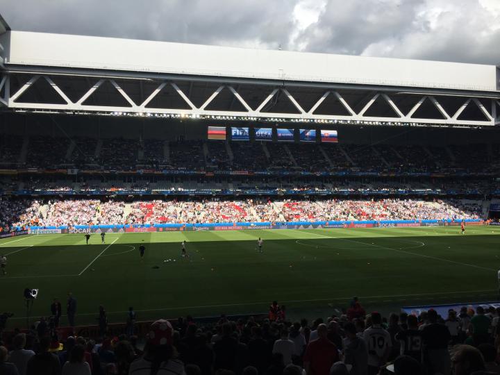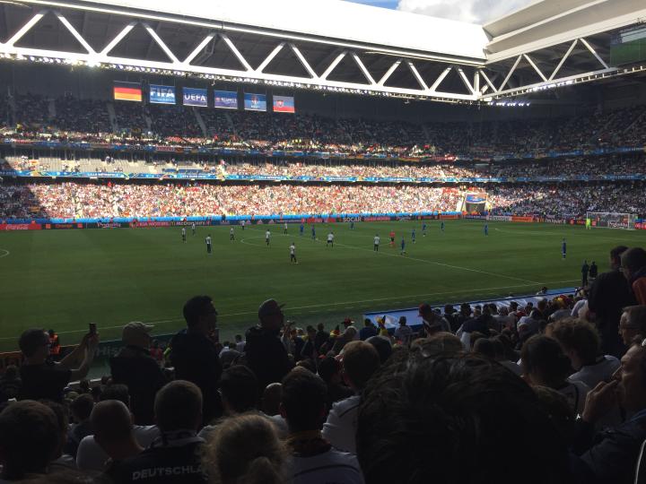 本以为当时面临着恐袭危险的法国欧洲杯安检过程会非常严格,结果却只有手检,连安检的机器都没有,坐地铁甚至都不需要任何安检。我带了一面中国国旗放在包里安检人员却不让我带进场,只能先放在球场的寄存处散场后再来取了。比赛的现场氛围非常好,赛前还有表演,德国球迷几乎把这里变成了自己的主场,远道而来的斯洛伐克球迷势单力孤只是占据了一个很小的角落。第一次到现场看欧洲杯的我们也是很激动,1992年第一次在电视上看欧洲杯的时候哪能想到有一天自己能亲临现场呢。