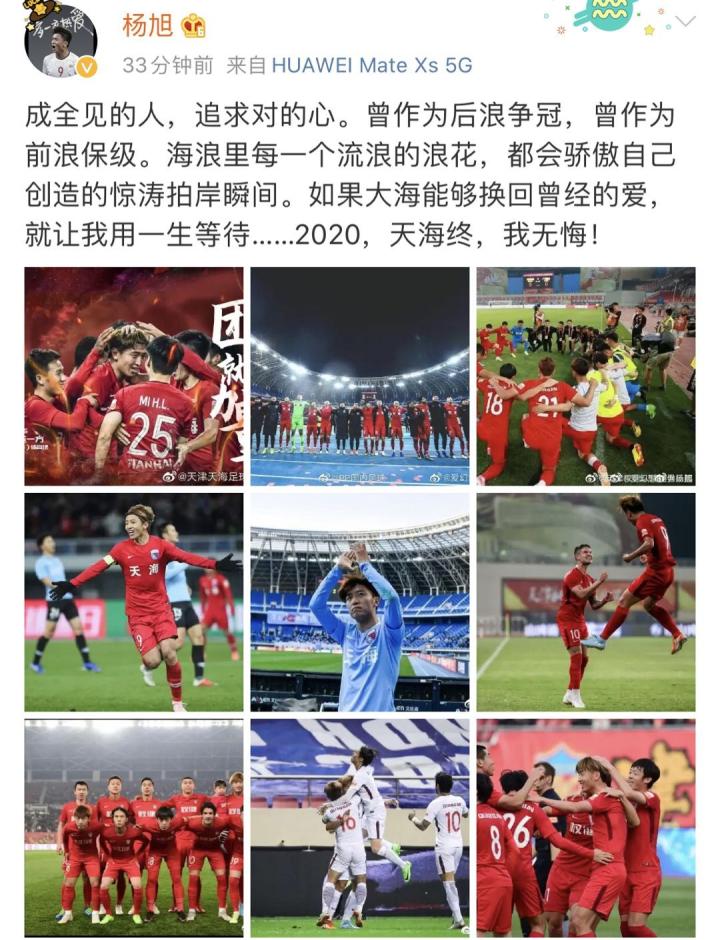杨旭在微博中引用了张雨生的《大海》中的歌词,他写道:“成全见的人,追求对的心。曾作为后浪争冠,曾作为前浪保级。海浪里每一个流浪的浪花,都会骄傲自己创造的惊涛拍岸瞬间。如果大海能够换回曾经的爱,就让我用一生等待……2020,天海终,我无悔!”