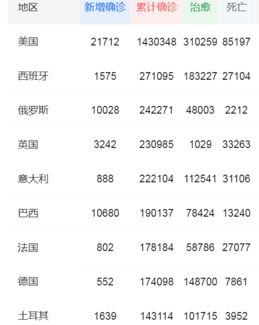 欧美部分国家疫情数据(截取于5月14日14时)