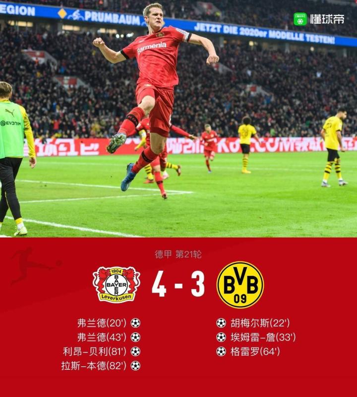 若想先一步直观了解德甲的风格特点,笔者在这里给大家推荐一场比赛,即本赛季第21轮勒沃库森与多特蒙德的较量,此役勒沃库森在主场以4-3的比分战胜了对手。