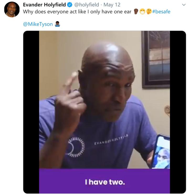 此前,霍利菲尔德“戴不上口罩”的表情包在国际上疯传,因为人们似乎都以为他失去了右耳。霍利菲尔德决定录视频澄清谣言,他说:“你看啊,他们都以为我只有一只耳朵,我真的有两个,让我来展示一下。”