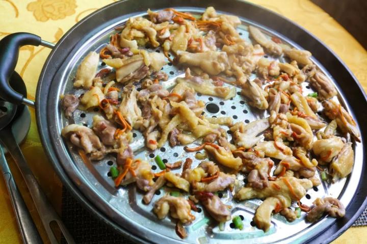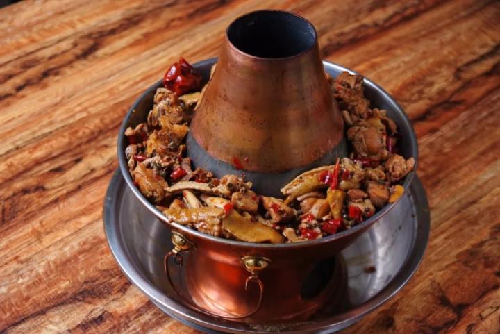 在鸡头上,小鸡炖蘑菇是东北人过年时招待女婿的标配,当地流传着“姑爷领进门,小鸡吓断魂”的说法;最西北的鸡尾处,新疆沙湾的大盘鸡最适合大块朵颐,连拌的面都得是裤带粗的宽面,让人望之顿生豪迈。