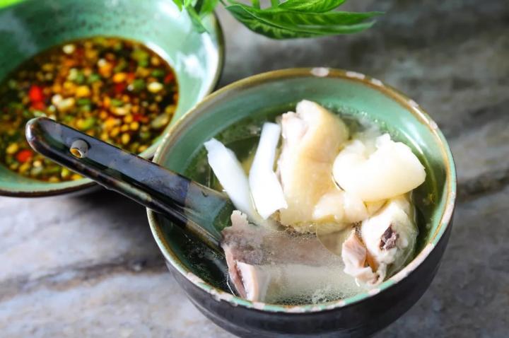 这样独具匠心的煮饭方法,使得鸡和米的味道充分融合,单是一碗鸡饭就足够香艳。目前仿佛出现一派丰收的稻田,母鸡带着小鸡在田垄上踱步,古人有诗云:“故人具鸡黍,邀我至田家”,正是这碗饭的绝佳注解。再配上一碗海南人的冬菜汤,也用鸡汤熬煮,真当是把鸡肉的味道发挥到了极限。