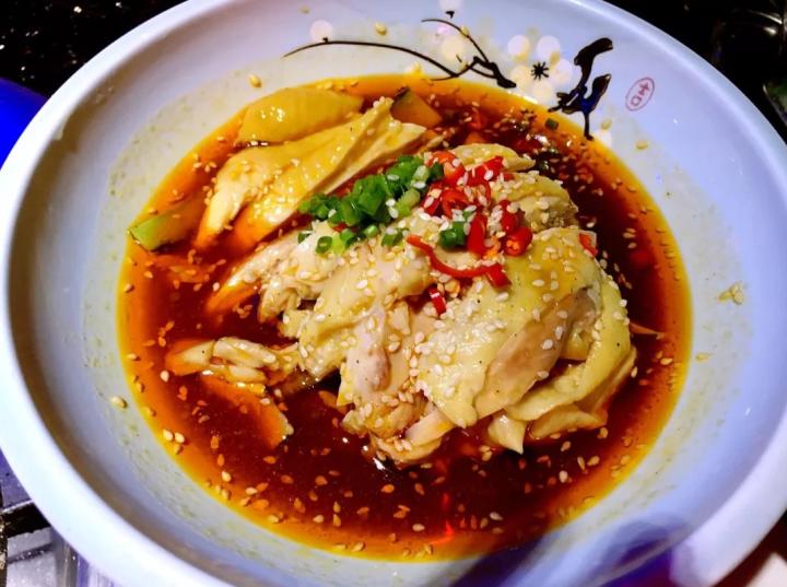 白切鸡入巴蜀之地,立即挂上了一层鲜红披风,名字也剽悍起来,唤作“白砍鸡”。乐山人郭沫若追忆少年时代,说“在故乡四川吃的白砍鸡,白生生的肉块,红殷殷的油辣子海椒,现在想来还口水长流……”又让其多了一个“口水鸡”的别称,其后做法稍有变更,却都少不了一勺红油画龙点睛。