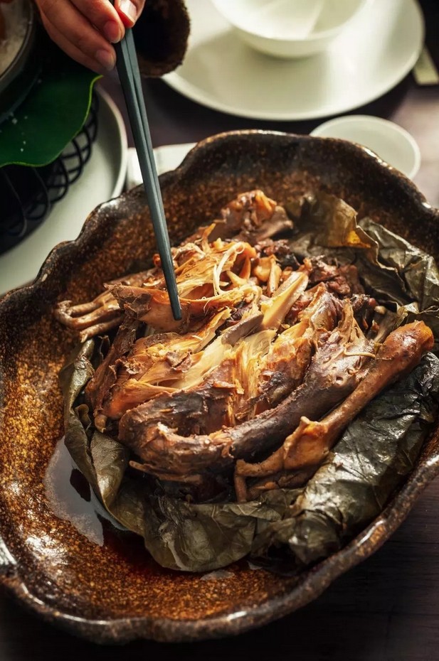 而到今天,叫花鸡的做法繁复了许多——首先当然得去羽毛,包裹黄泥前还要先包一层荷叶,内蕴荷香;封泥也有讲究,黄泥中还掺入了砻糠(稻谷壳)、稻草屑和酒脚,烤制时散发出稻香和酒香;煨烤的燃料则以常熟虞山上的马尾松松枝、松针为佳,松烟赋予了叫化鸡特殊的松柏香气。烤成之后,奋力砸开封泥,扒开荷叶,层层环绕的香味一瞬间迸发,香飘十里。也正是如此,才能引来美食界的“绝代高手”们流连驻足。