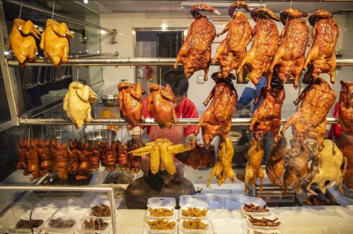 ▲广式烧腊店里的白切鸡、烧鸡和烧鹅。图/视觉中国