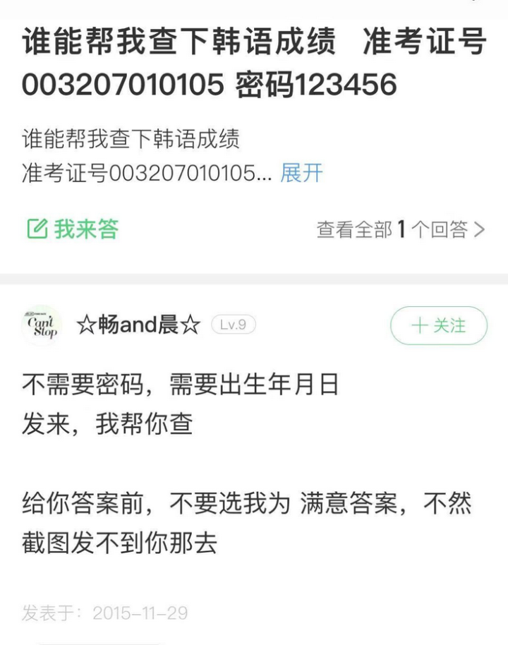 2015年11月,国内韩语Topik成绩公布后,国内查成绩的网站瘫痪了两天,有人在百度知道上求助,☆畅and晨☆因为人在韩国查成绩不受影响,不到2天时间内帮30多个陌生人查了韩语成绩。